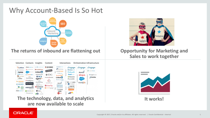 To address these challenges, this Oracle Account-Based Playbook was created to provide Oracle teams a prescriptive plan for developing successful account-based programs. The playbook incorporates best practices and includes step-by-step guidelines, tools, examples, and recommendations to design, build, and manage successful account-based programs.