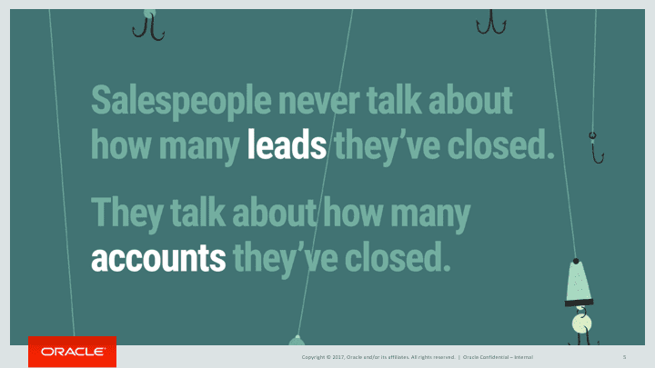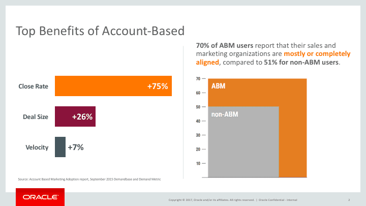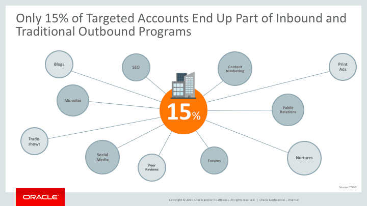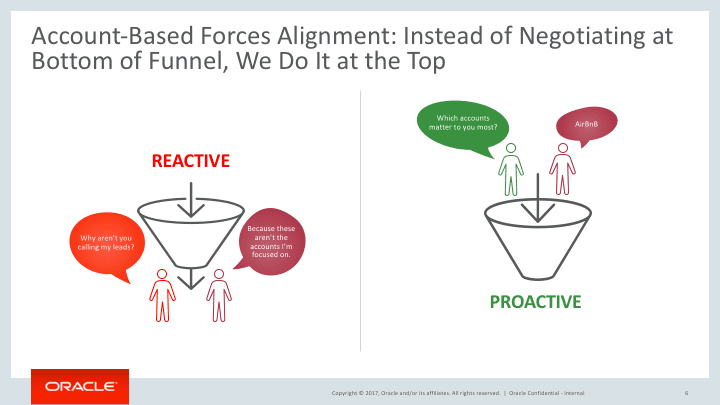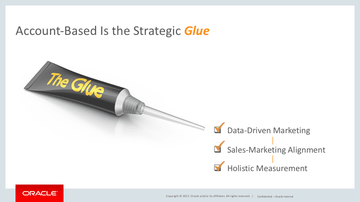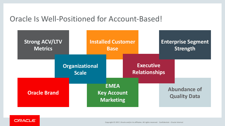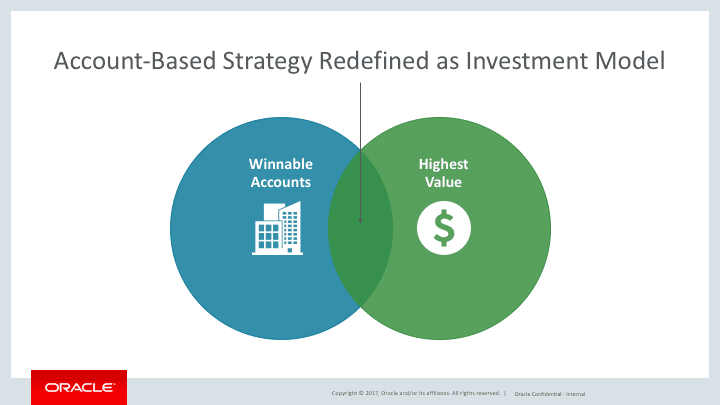 The solution is to focus on the best fit, most valuable accounts—an account-based approach. This dramatic shift comes with its own challenge: How does Oracle adapt to a new way of doing business? An account-based strategy requires new approaches in several areas, including: