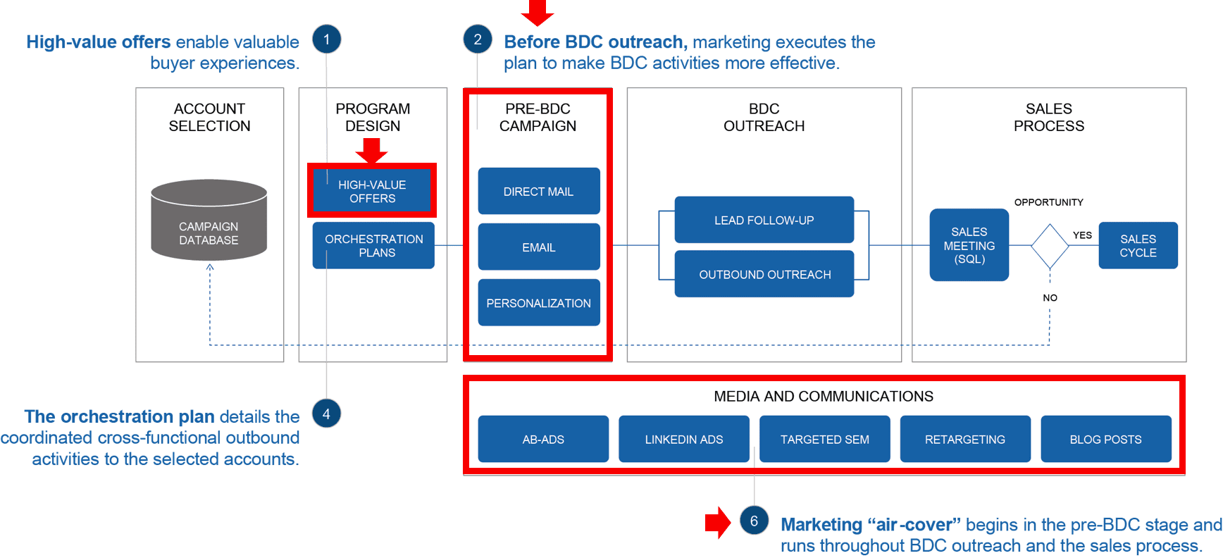 The pre-BDC elements of the program are executed primarily by marketing and lean heavily on traditional marketing activities. The emphasis on a call-to-action and on direct response metrics is reduced; these activities are designed instead to improve the effectiveness of BDC outreach first and foremost.